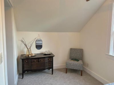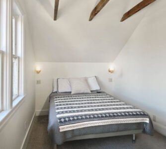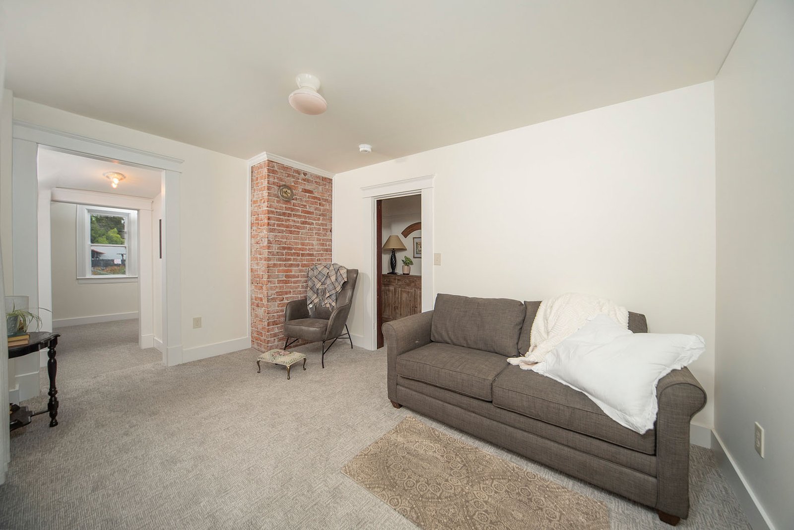 The Mt. Stuart Room is a cozy hideaway that blends modern comfort with timeless character. Tucked away on the second floor, this spacious 344 square foot suite gives you the best of both worlds – a private bedroom with a queen bed and a separate living room with a hide-a-bed for extra guests or just extra lounging. The sloped ceilings, exposed beams, and soft lighting give the room a warm, inviting feel that makes it easy to relax.