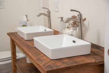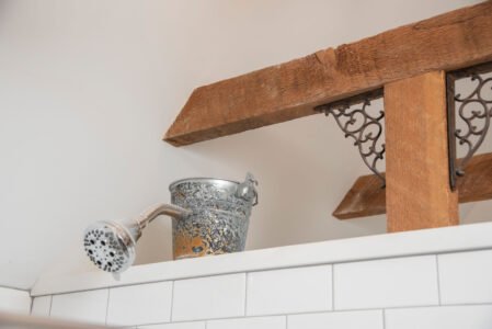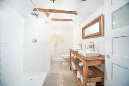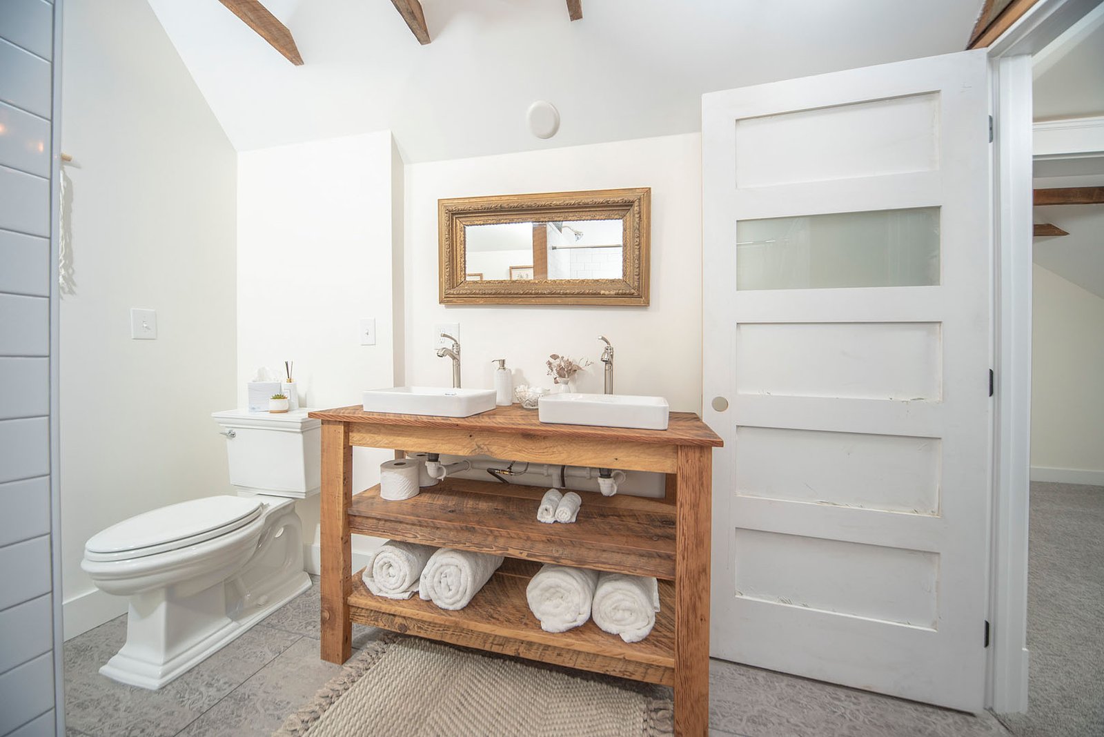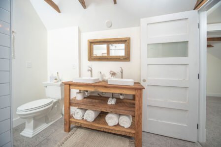 You’ll find thoughtful touches throughout, from dimmable bedside lights and USB charging ports to a smart TV for winding down at night. Whether you’re brewing a fresh cup in the French press or steeping some tea before bed, your little kitchenette setup has you covered. The private en suite bathroom is bright and stylish, with a walk-in shower, double vanity, and a rustic wood counter that feels both fresh and familiar.